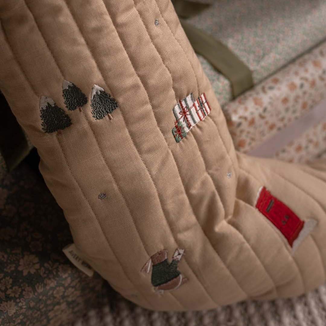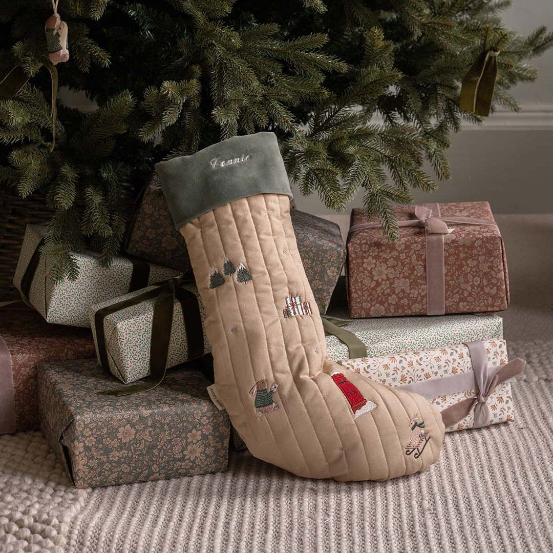 Bring the magic of Christmas to life with our Christmas Stockings – create their favourite tradition for years to come. Each stocking is made with lightly quilted organic cotton, delicate embroidery and a luxurious velvet cuff. They are perfect for filling with toys, treats, and small gifts. These eco-friendly Christmas stockings are designed to be a cherished part of festive family celebrations. Personalise the cuff with your little one’s name or family surname using our embroidery service.