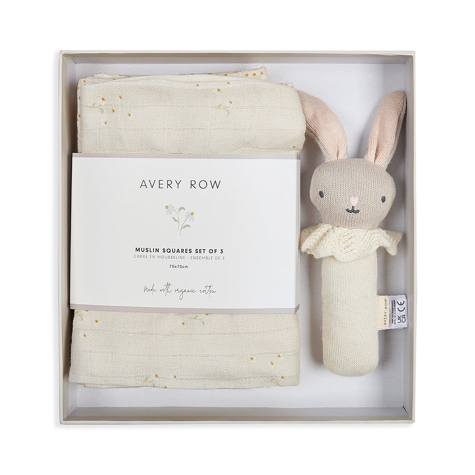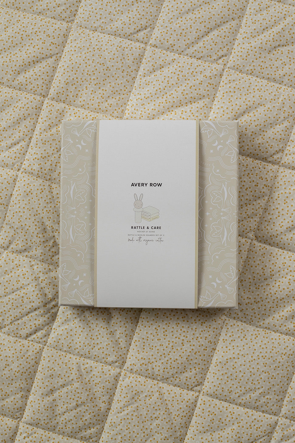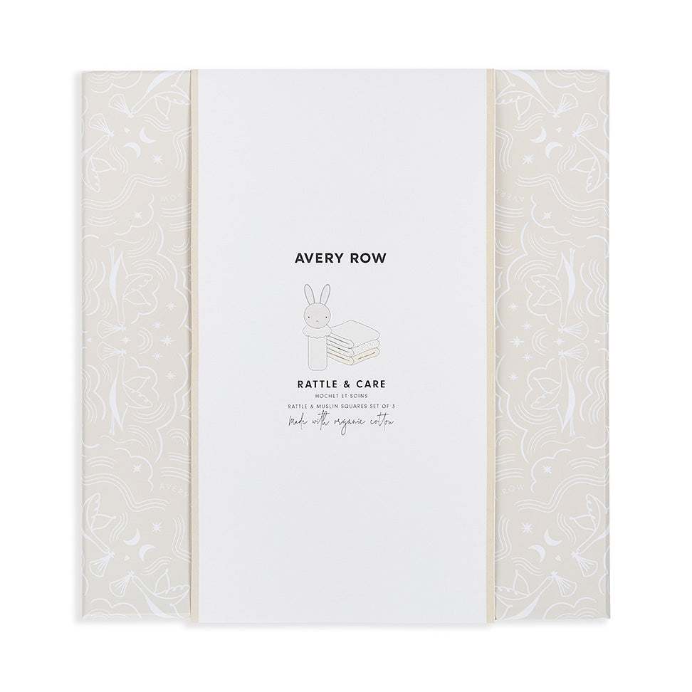 Welcome little ones into the world with our Rattle & Care New Baby Gift Set, the perfect newborn or baby shower gift. Thoughtfully curated for precious first moments, this new baby gift set includes our soft organic cotton muslins set of 3 and adorable knitted baby rattle, beautifully presented in a hand-illustrated Avery Row gift box.