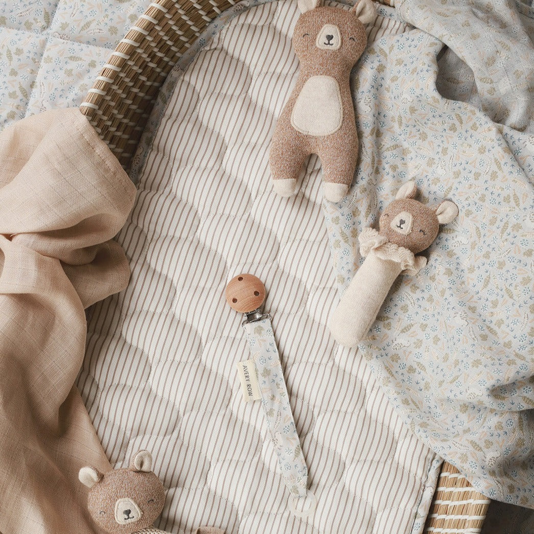 Meet your little one’s first friend - our Brave Bear Organic Cotton Rattle. Designed for tiny hands to grip, shake and squish, this sweet rattle brings joy to playtime while helping develop early motor skills. With its gentle sound, soft texture and adorable neck ruff this rattle makes an adorable new baby gift.