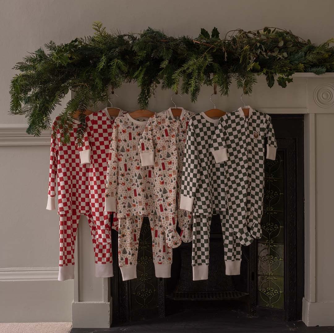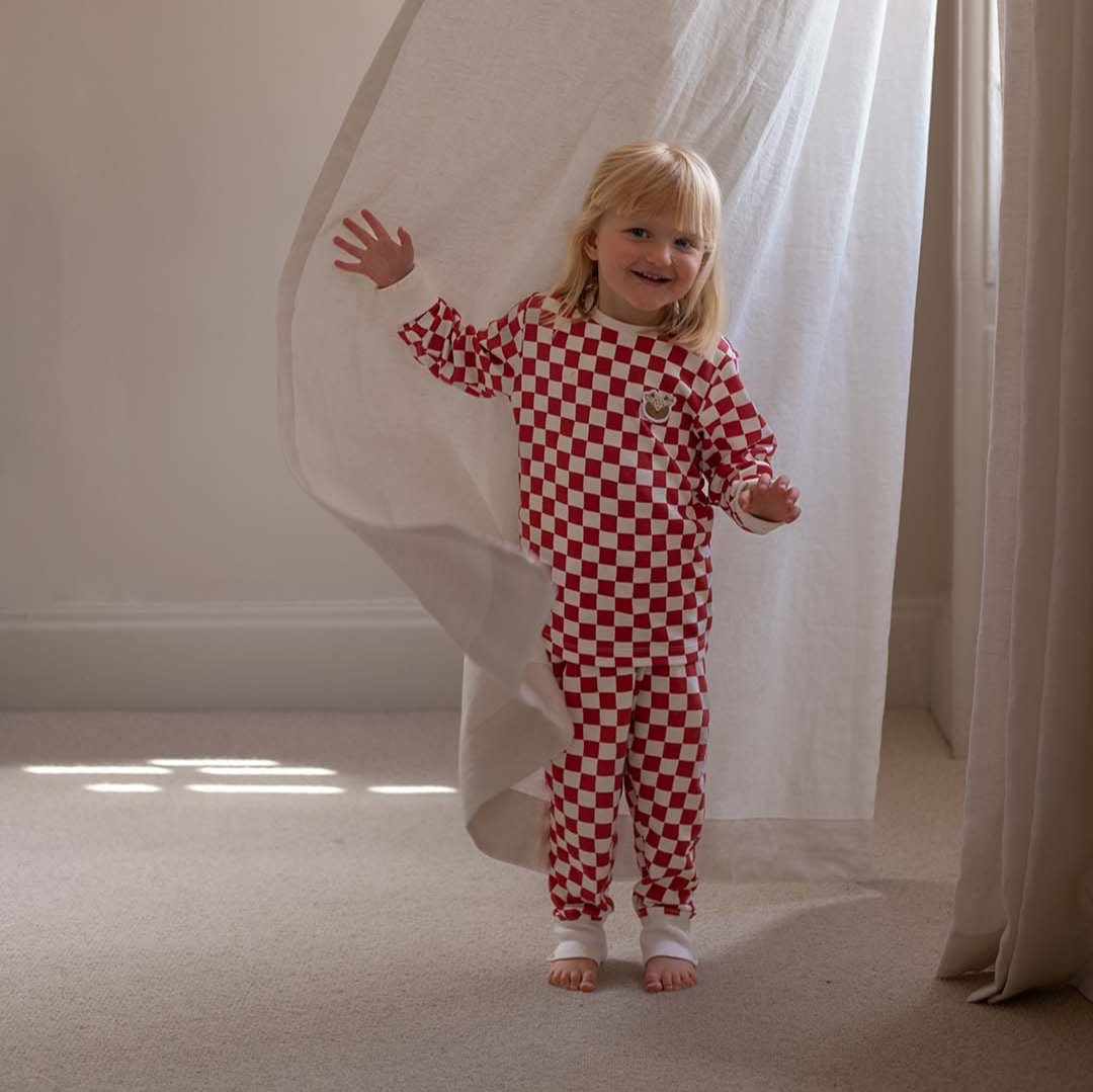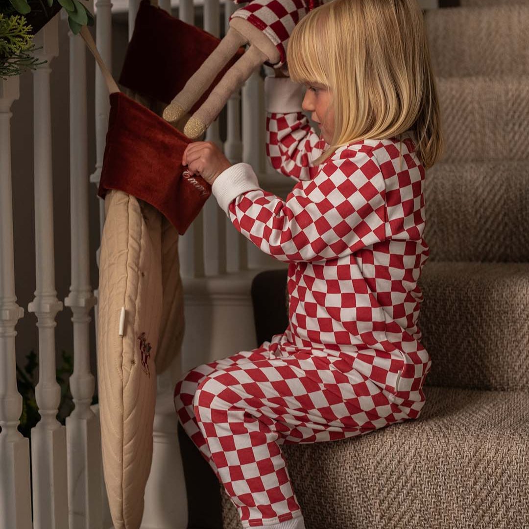 Snuggle your little one in cosy comfort with our Red Checkerboard Christmas Pyjamas, crafted from the softest 100% organic cotton jersey. Featuring playful festive red checkerboard pattern complemented by an embroidered sweet and sparkly Reindeer patch on the chest.