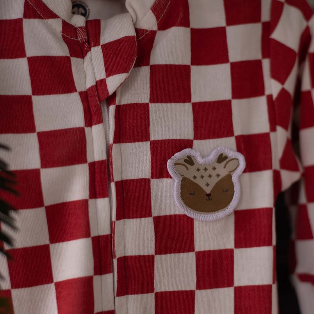 Snuggle your little one in our cosy Red Checkerboard Christmas Sleepsuit, crafted from the softest 100% organic cotton jersey. Featuring a festive red checkerboard pattern complemented by an embroidered sweet and sparkly Reindeer patch on the chest.